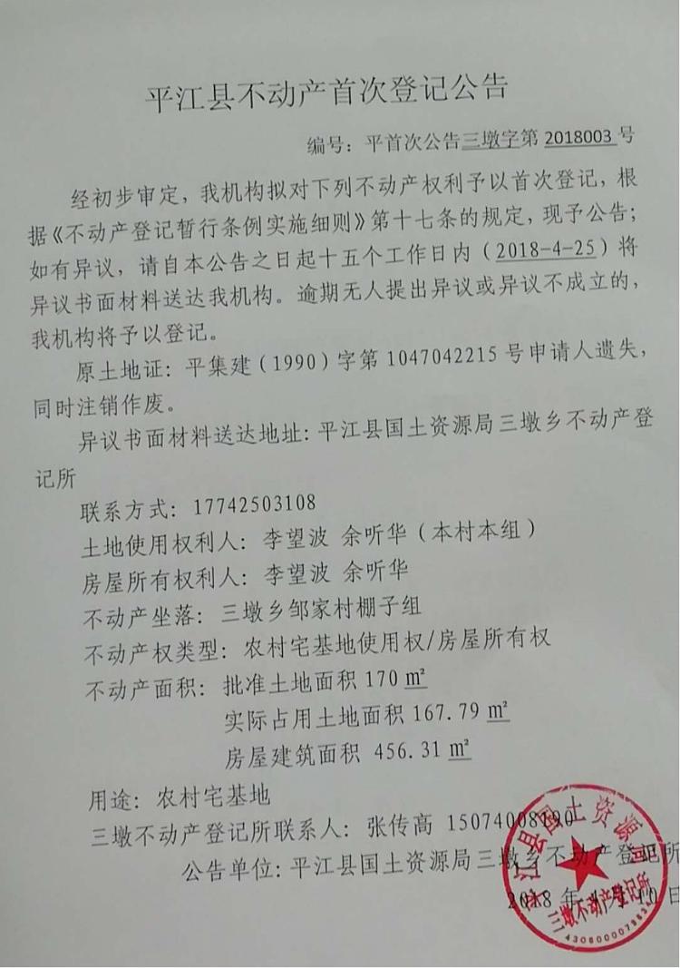 李望波 余听华不动产首次登记公告平三墩字第2018003号