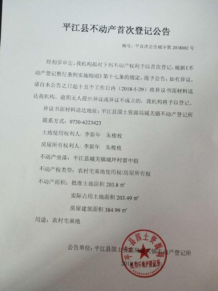 李新年 朱梭枚不动产首次登记公告平城字第2018002号