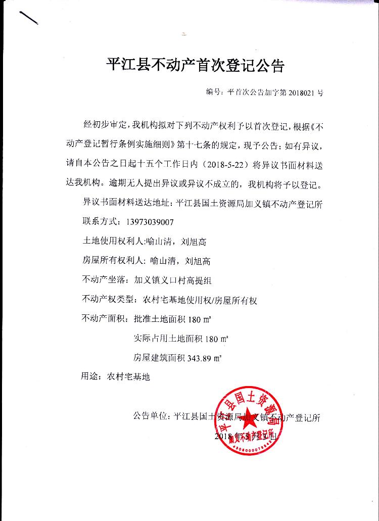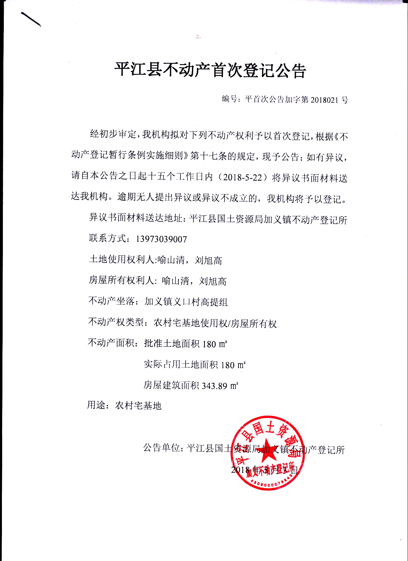 喻山清 刘旭高不动产首次登记公告平加字第2018021号