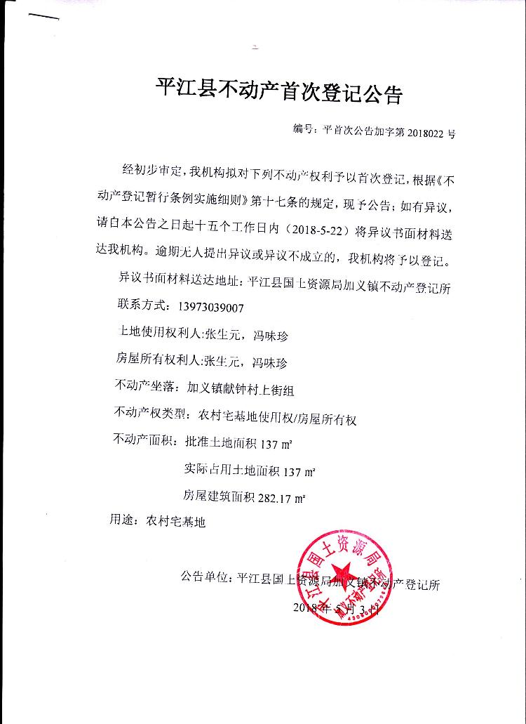 张生元 冯味珍不动产首次登记公告平加字第2018022号