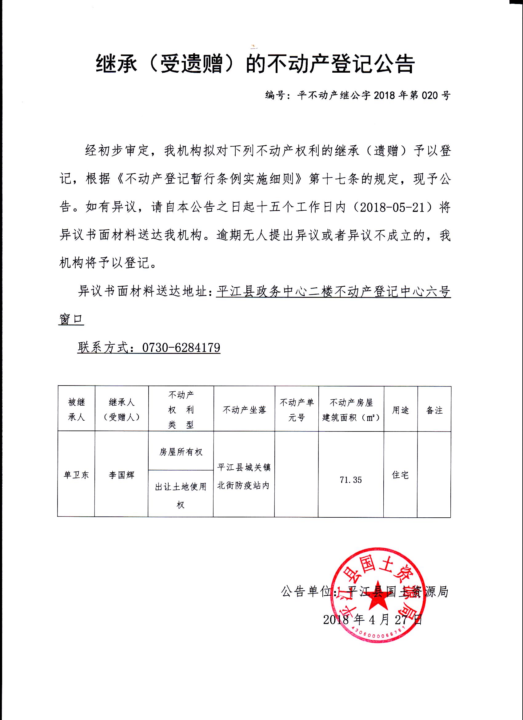 李国辉继承(受遗赠)的不动产登记公告平不动产继公字2018年第020号