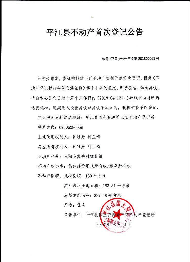 钟牡丹 钟卫清不动产登记平三字第201800021号
