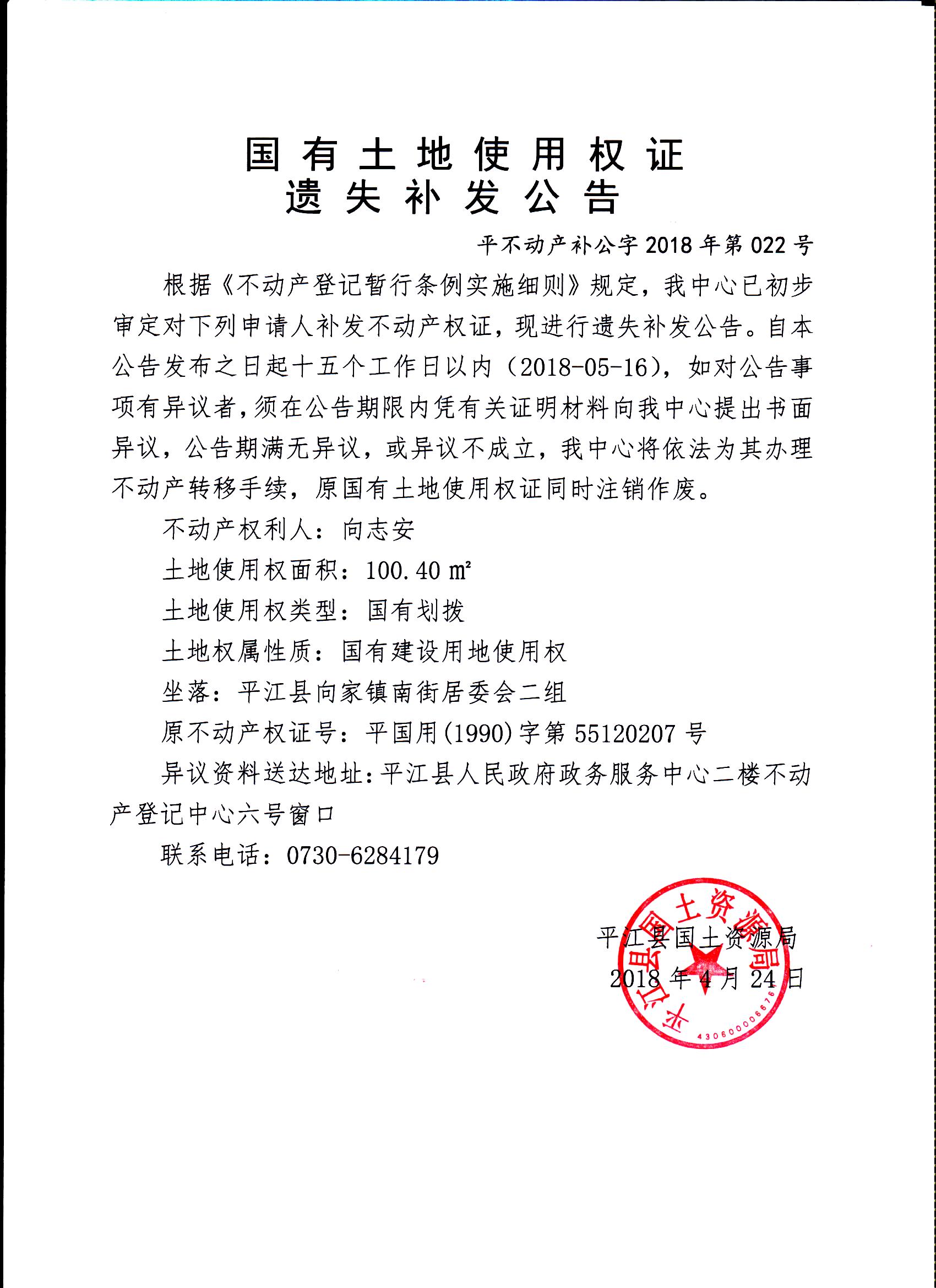 向志安国有土地使用权证遗失补发公告平不动产补公字2018年第022号