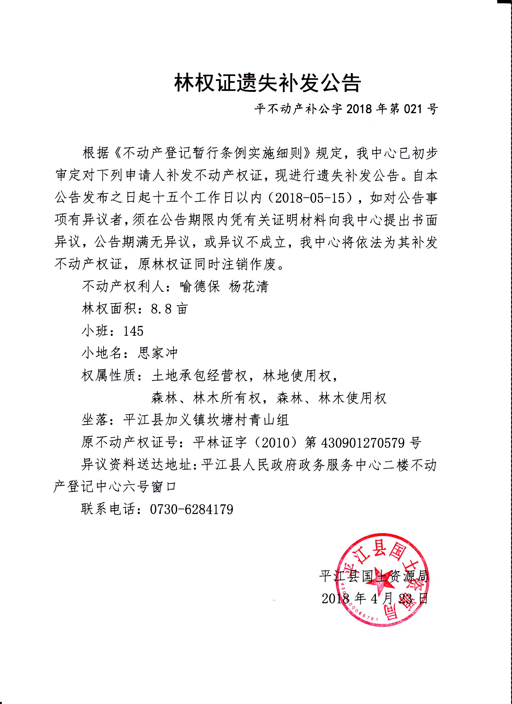 喻德保、杨花清林权证遗失补发公告平不动产补公字2018年第021号