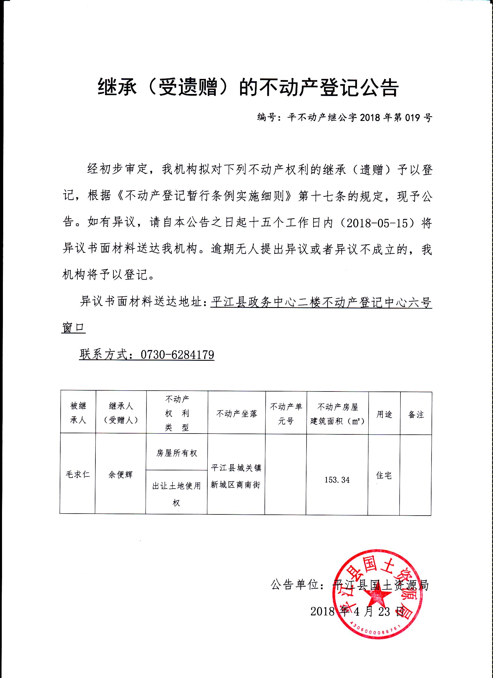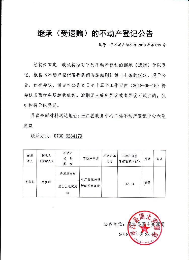 余便辉继承(受遗赠)的不动产登记公告平不动产继公字2018年第019号