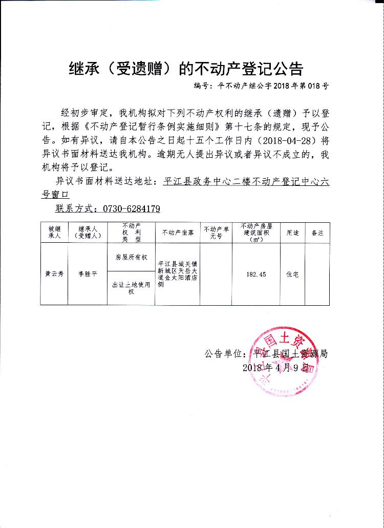 李胜平继承(受遗赠)的不动产登记公告平不动产继公字2018年第018号