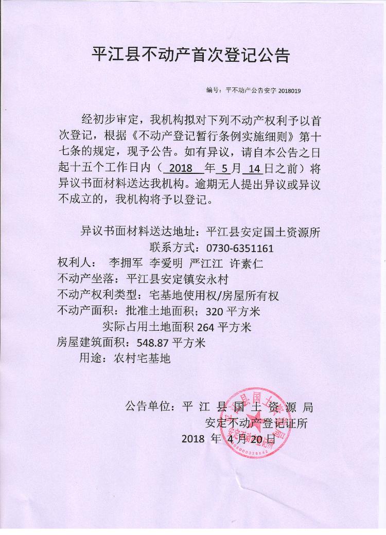 李拥军 李爱明 严江江 许素仁不动产登记平安字2018019