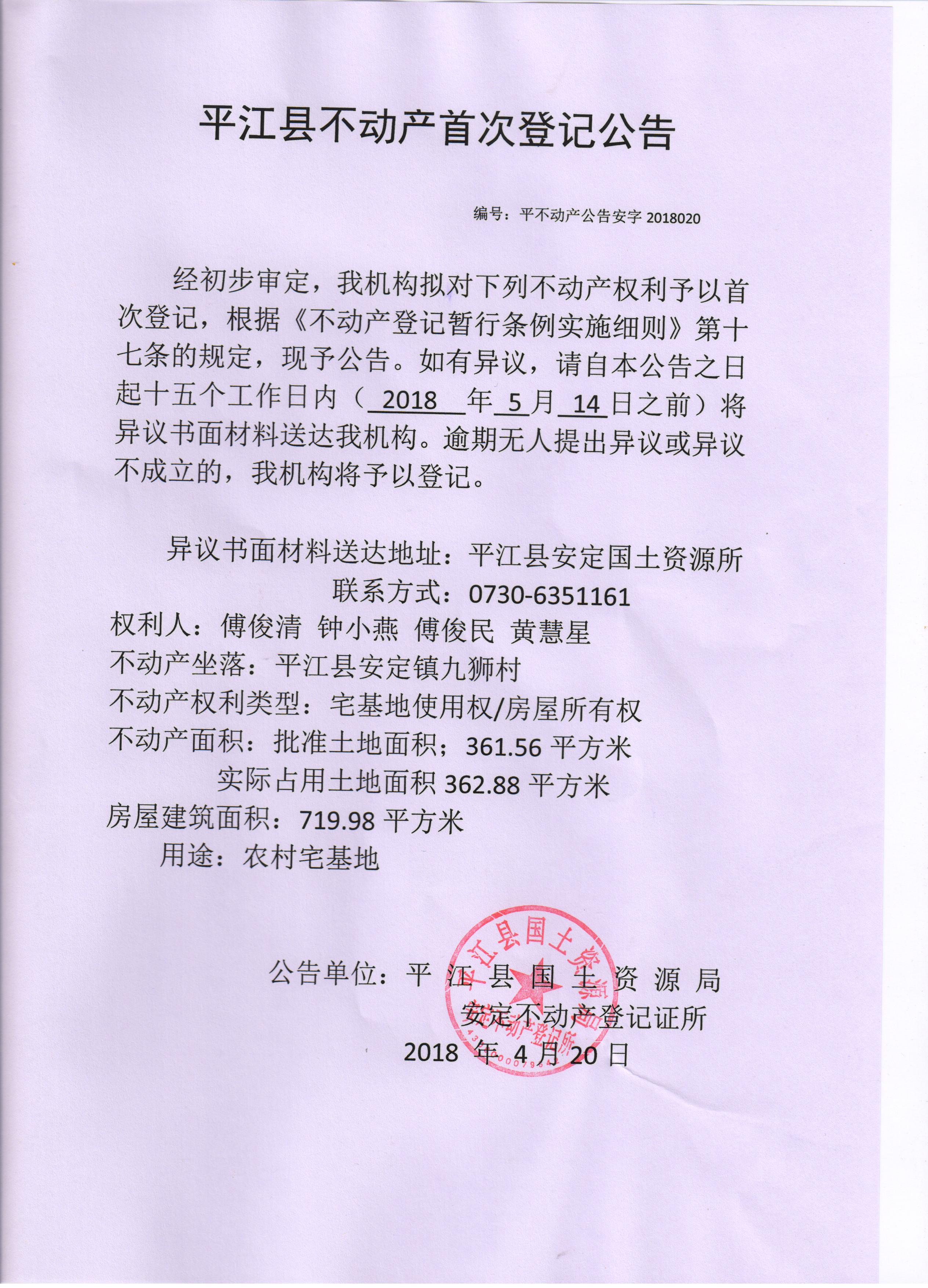 傅俊清 傅俊民 钟小燕 黄慧星不动产登平安字2018020