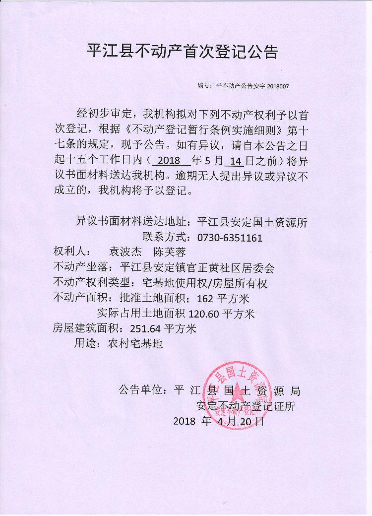 袁杰波 陈芙蓉不动产登记平安字2018007