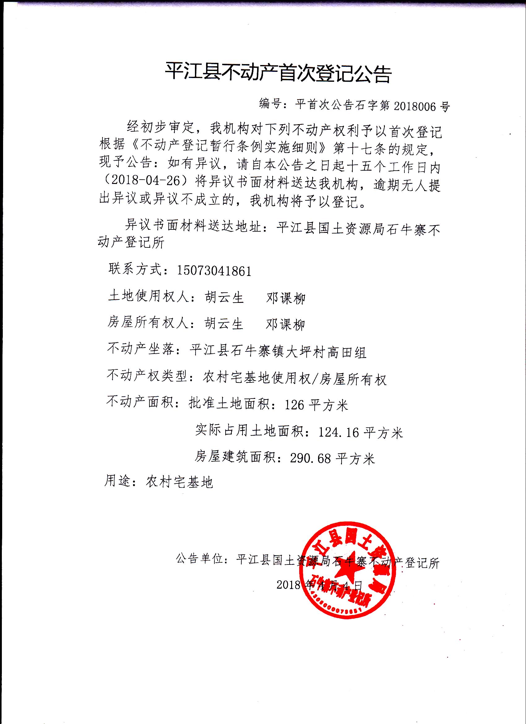 胡云生 邓课柳不动产首次登记公告