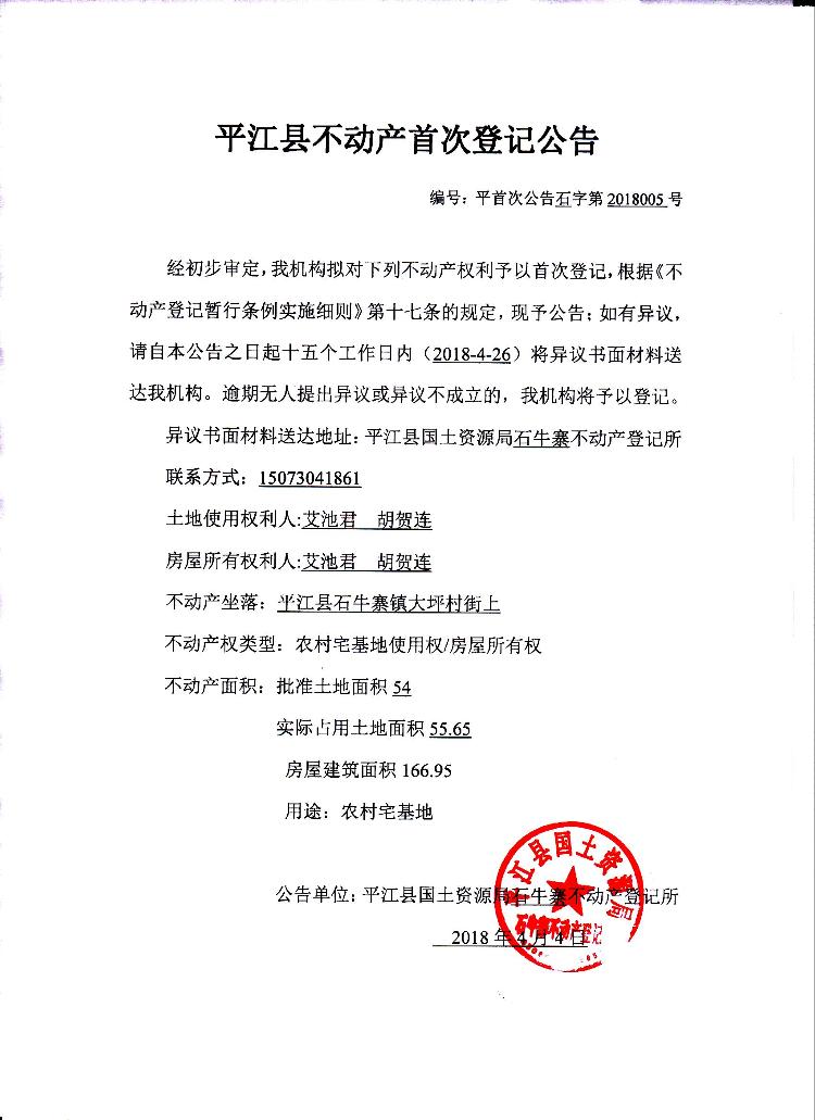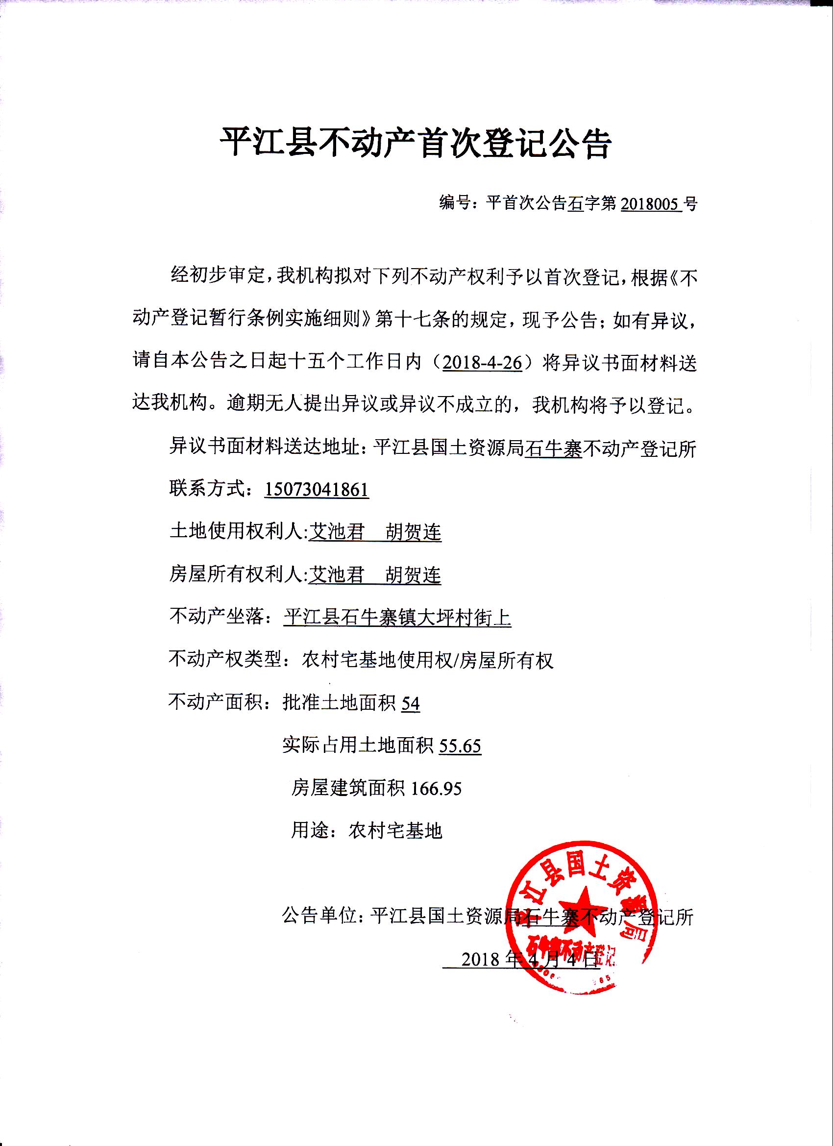 艾池君、胡贺连不动产首次登记公告