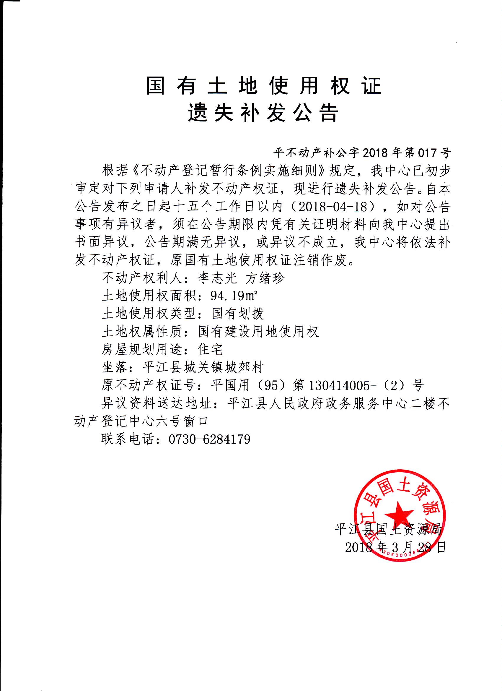 李志光、方绪珍国有土地使用权证遗失补发公告平不动产补公字2018年第017号