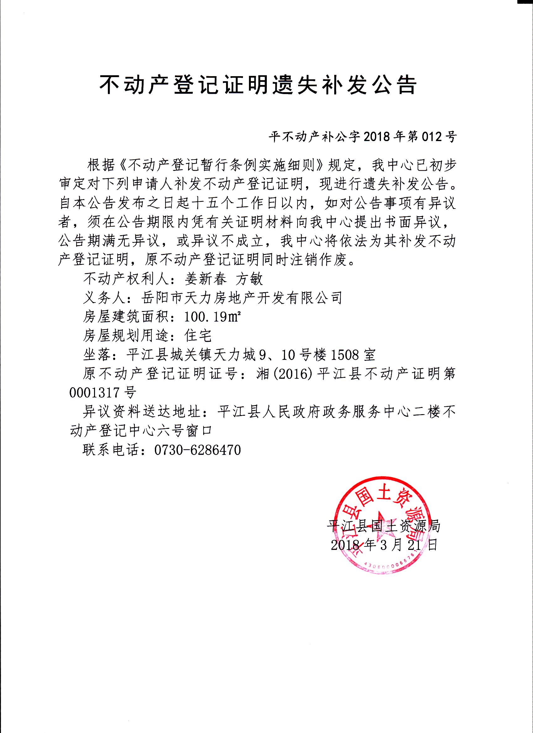 姜新春、方敏不动产登记证明遗失补发公告平不动产补公字2018年第012号