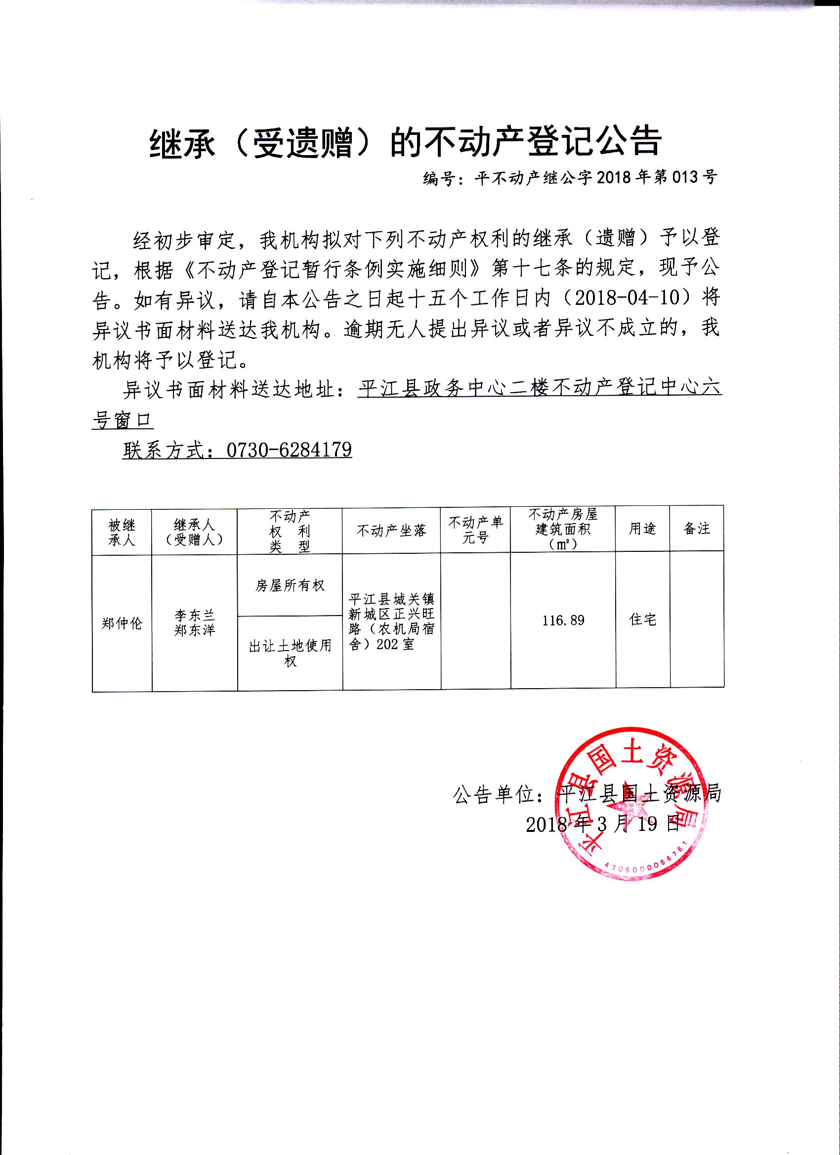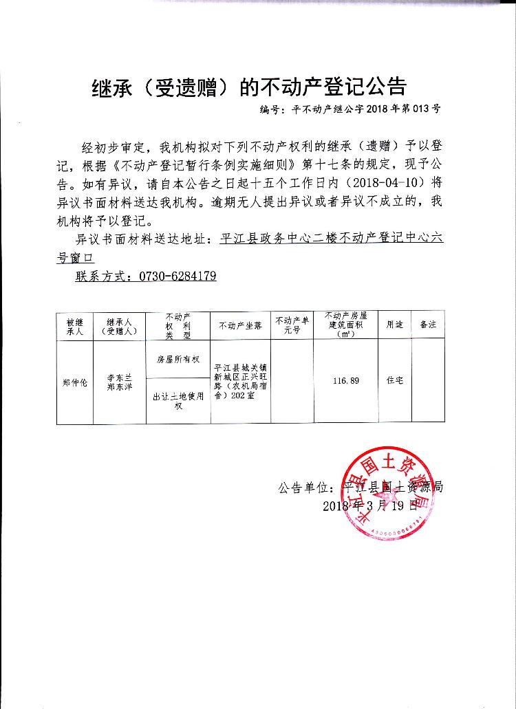 李东兰、郑东洋继承(受遗赠)的不动产登记公告平不动产继公字2018年第013号
