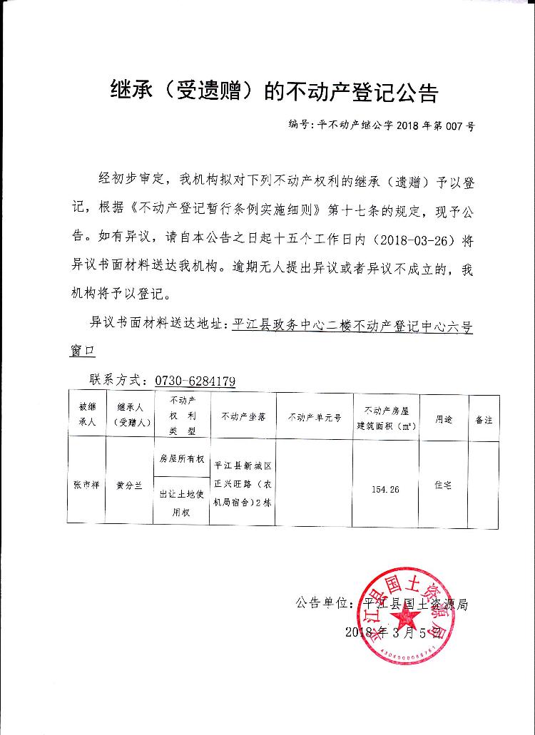 黄分兰继承(受遗赠)的不动产登记公告平不动产继公字2018年第007号