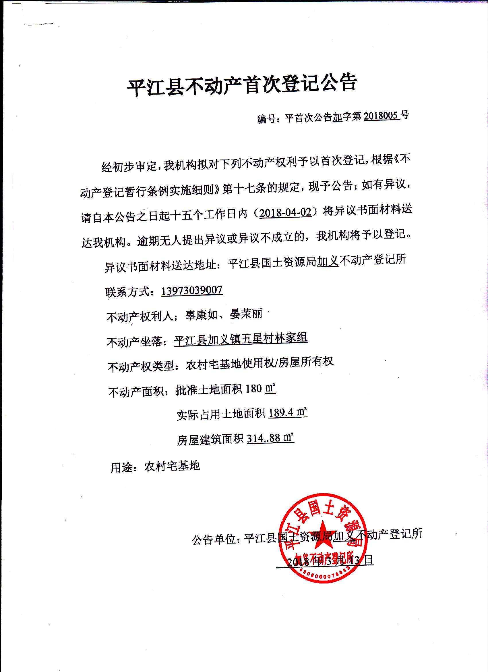辜康如、晏茉丽不动产首次登记公告平首次公告加字第2018005号