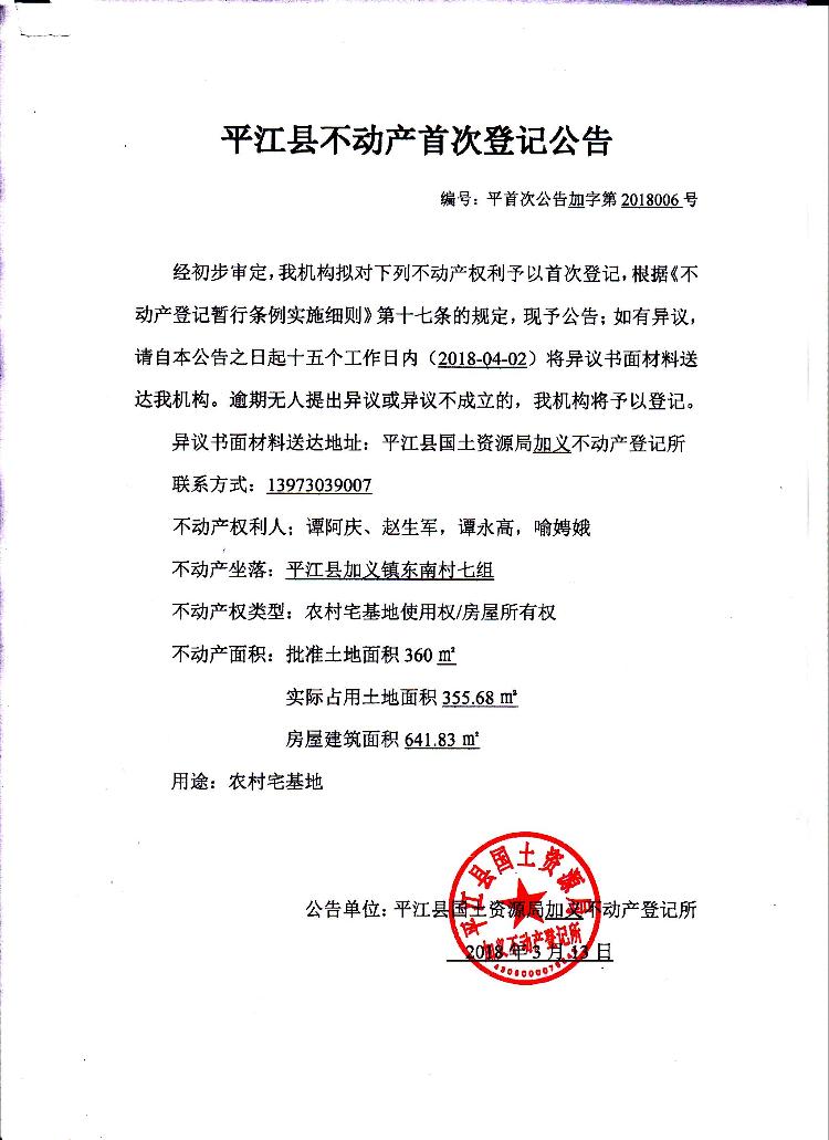谭阿庆、赵生军、谭永高、喻娉娥不动产首次登记公告平首次公告加字第2018006号