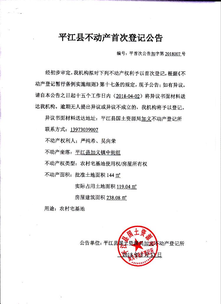 严纯希、吴向荣不动产首次登记公告平首次公告加字第20018007号