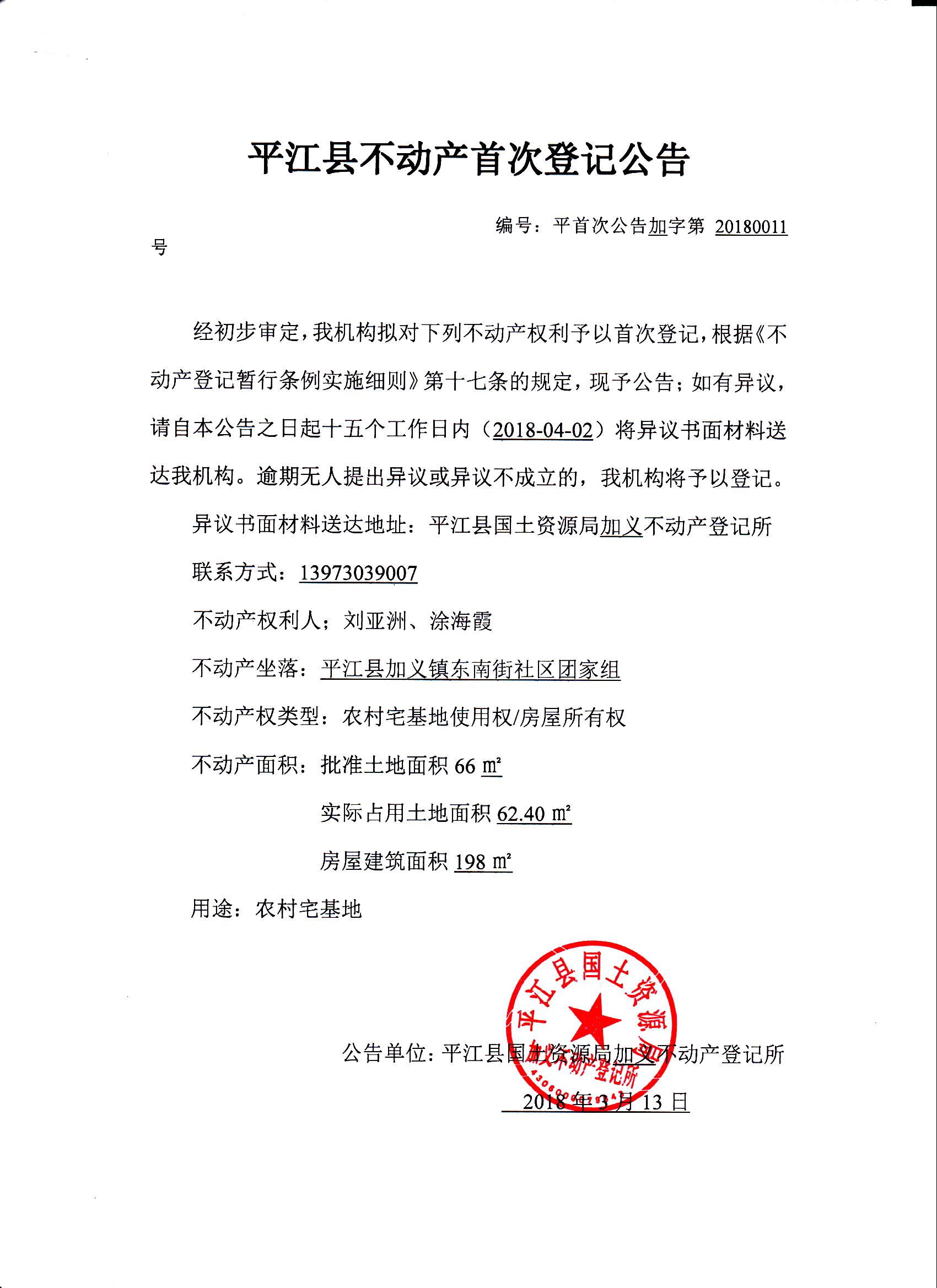 刘亚洲、涂海霞不动产首次登记公告平首次公告加字第20180011号