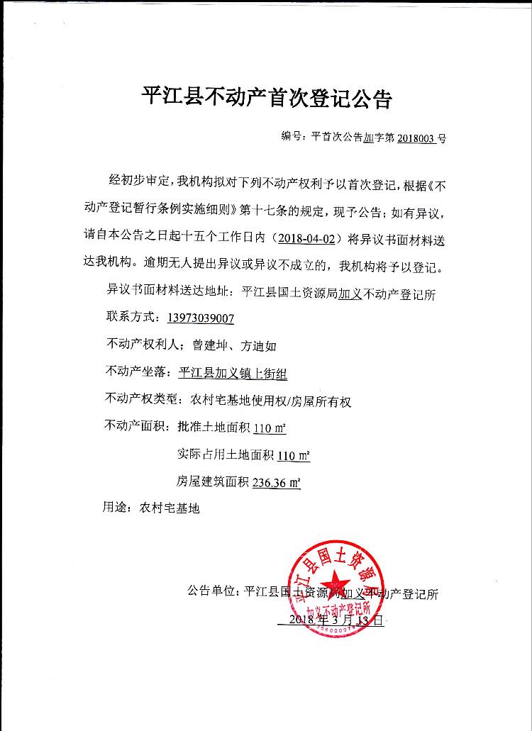 曾建坤方迪如不动产首次登记公告平首次公告加字第2018003号