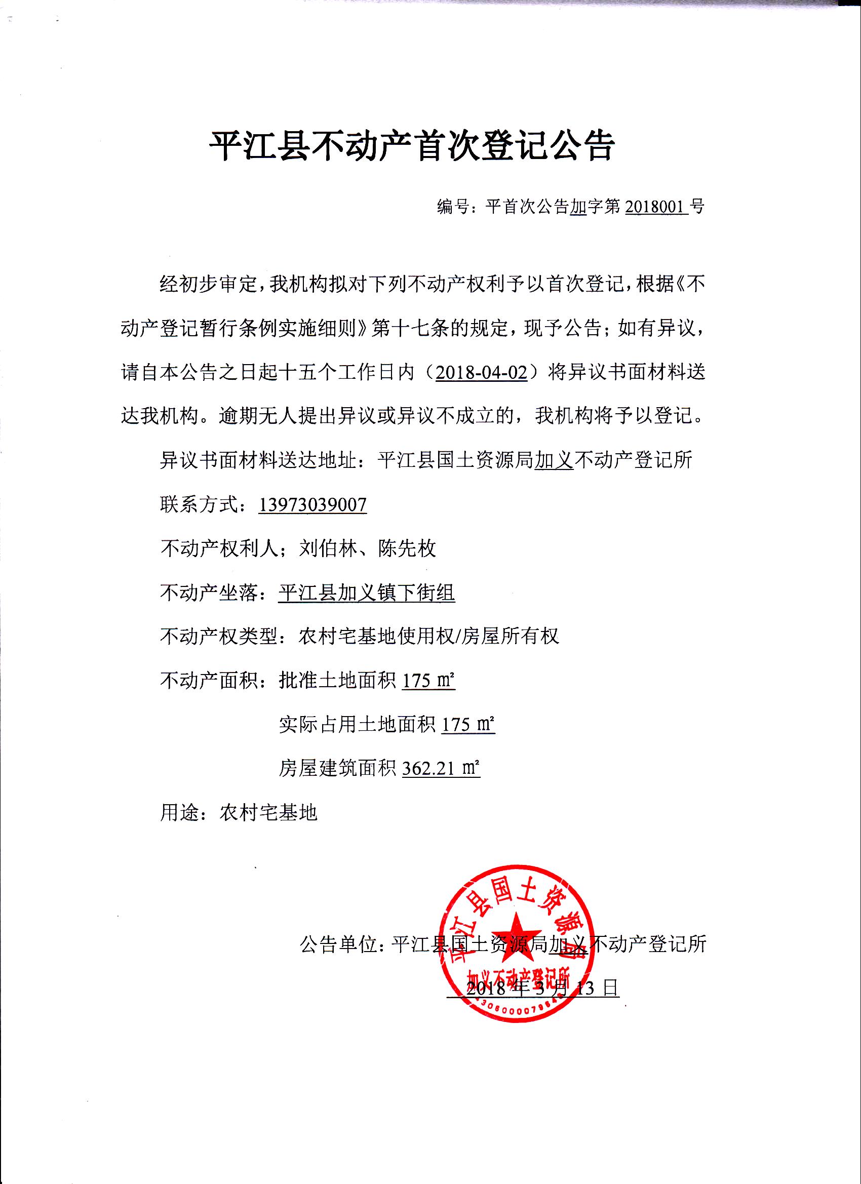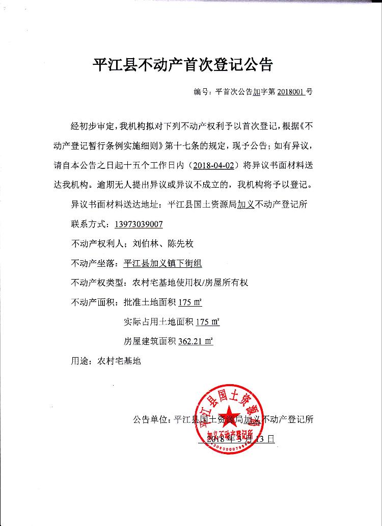 刘伯林、陈先枚不动产首次登记公告平首次公告加字第2018001号