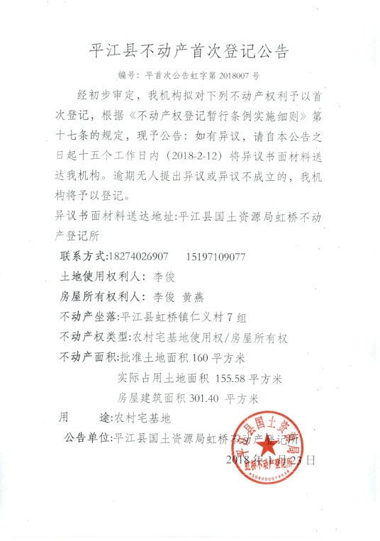 李俊不动产首次登记公告