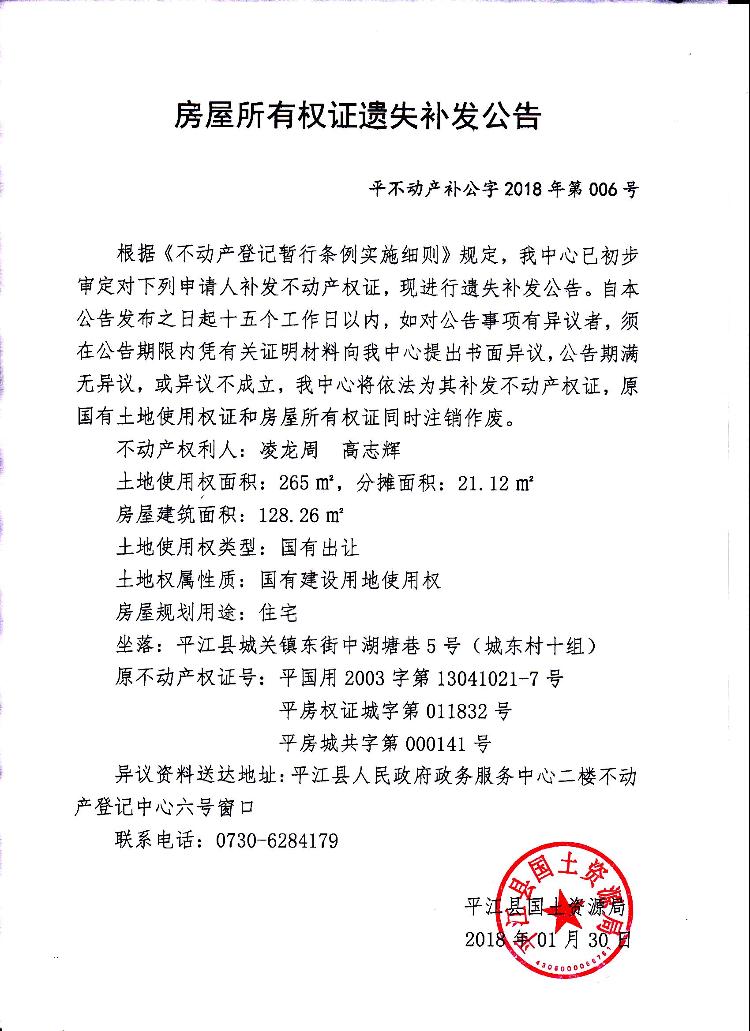 凌龙周、高志辉房屋所有权证、共有权证遗失补发公告