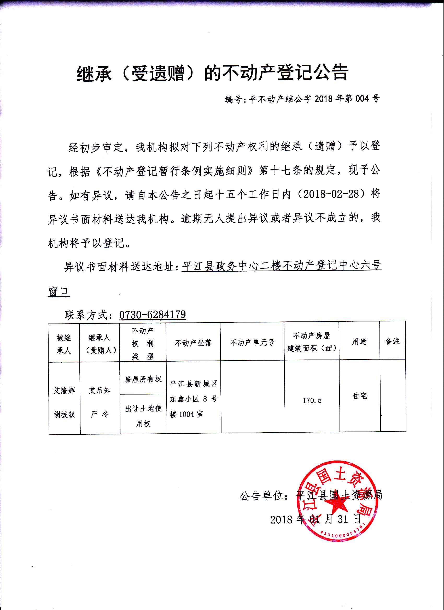 艾后知 严冬继承(受遗赠)的不动产登记公告