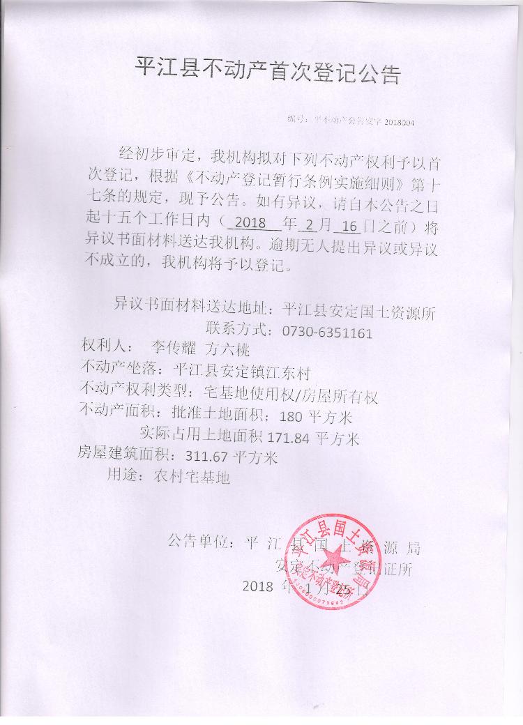 李传耀 方六桃不动产登记公告