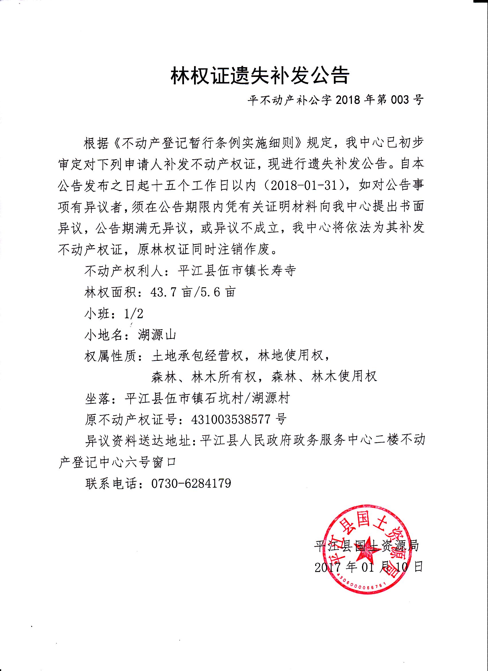平江县伍市镇长寿寺林权证遗失补发公告2018003号