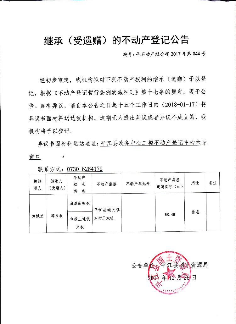 邱果根继承(受遗赠)的不动产登记公告2017044号
