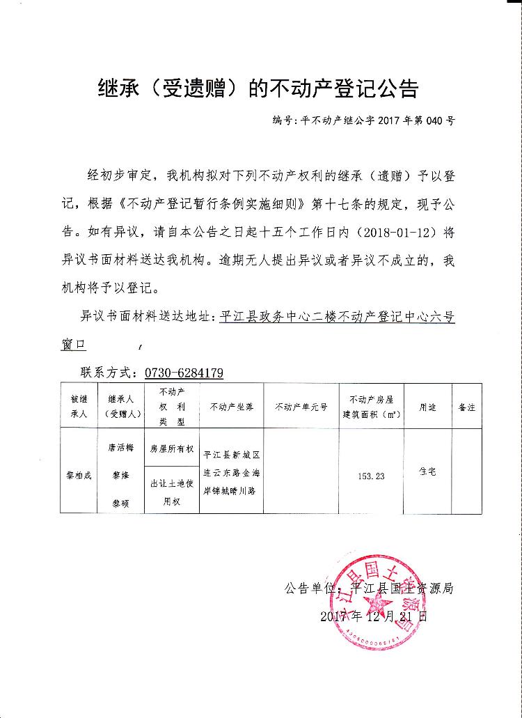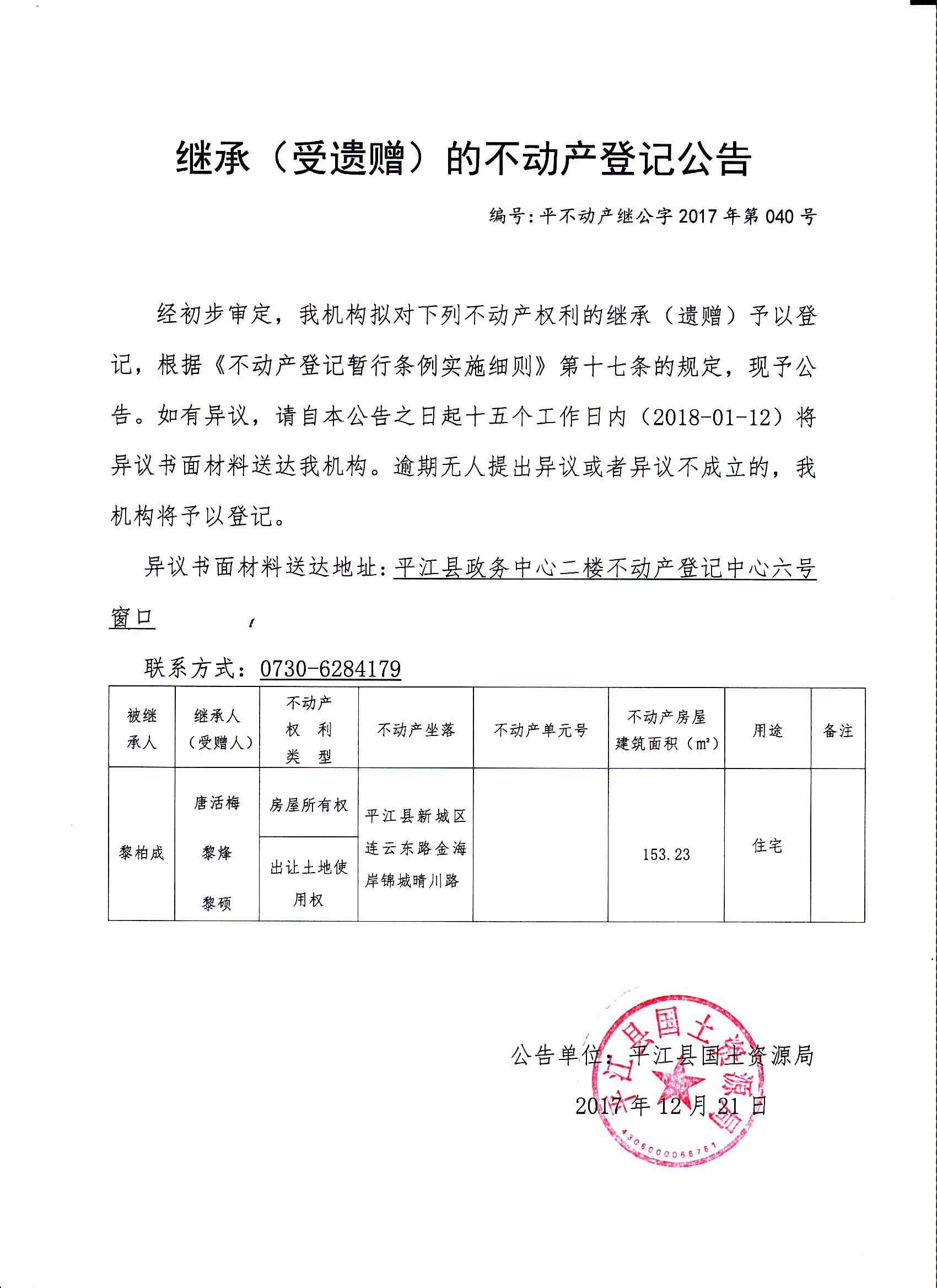 唐活梅黎烽黎硕继承(受遗赠)的不动产登记公告2017040号