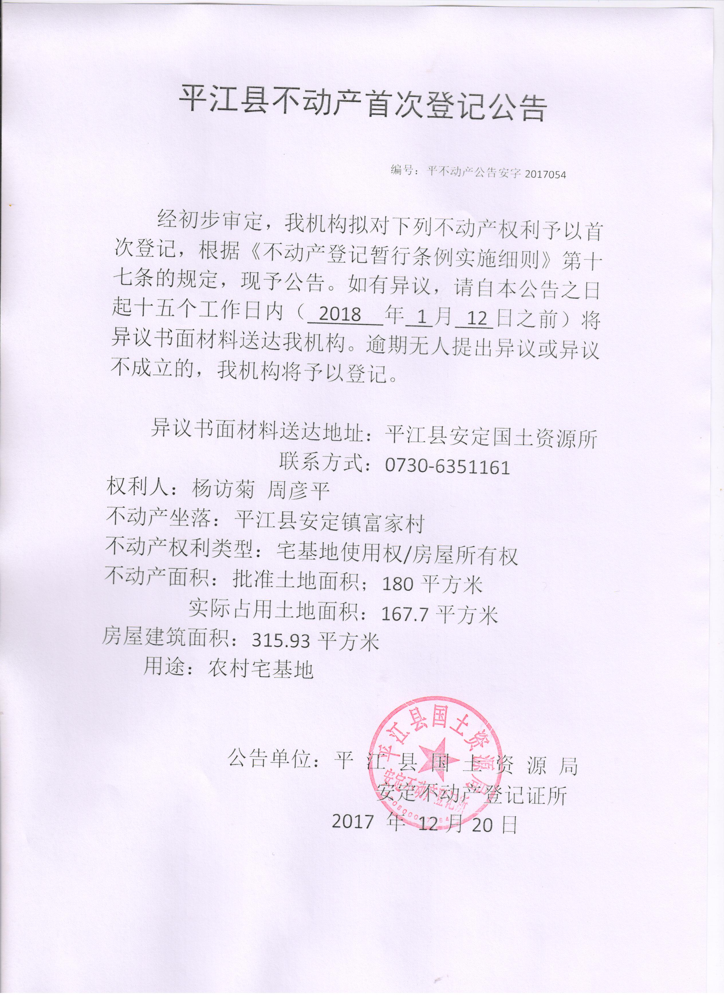 杨访菊 周彦平 不动产登记证平安字2017054