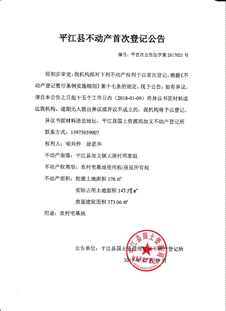 喻兴仲、涂思华不动产首次登记公告