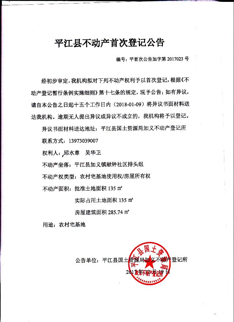 邱水章、吴华卫不动产首次登记公告