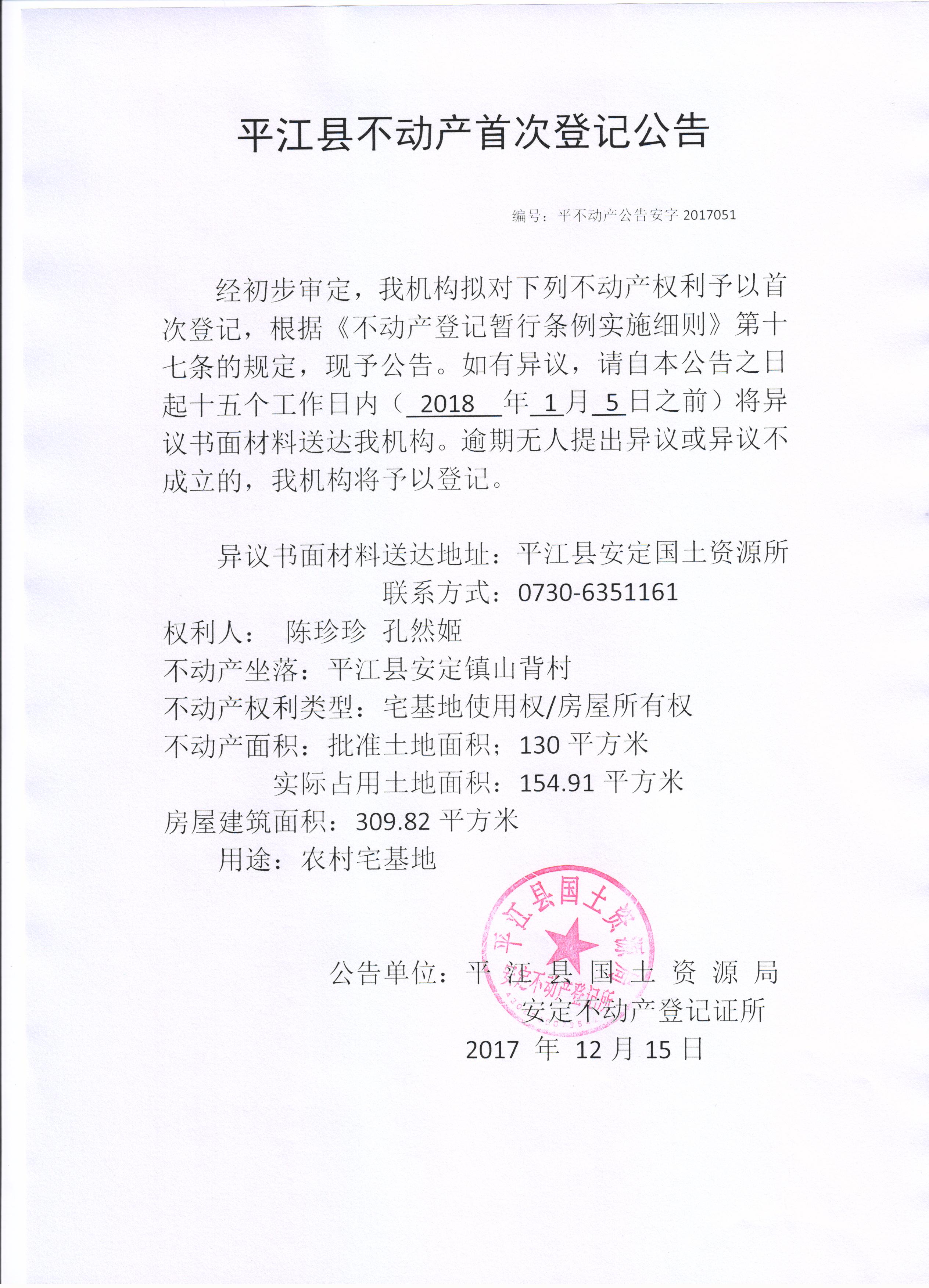陈珍珍 孔然姬 不动产登记平安字2017051