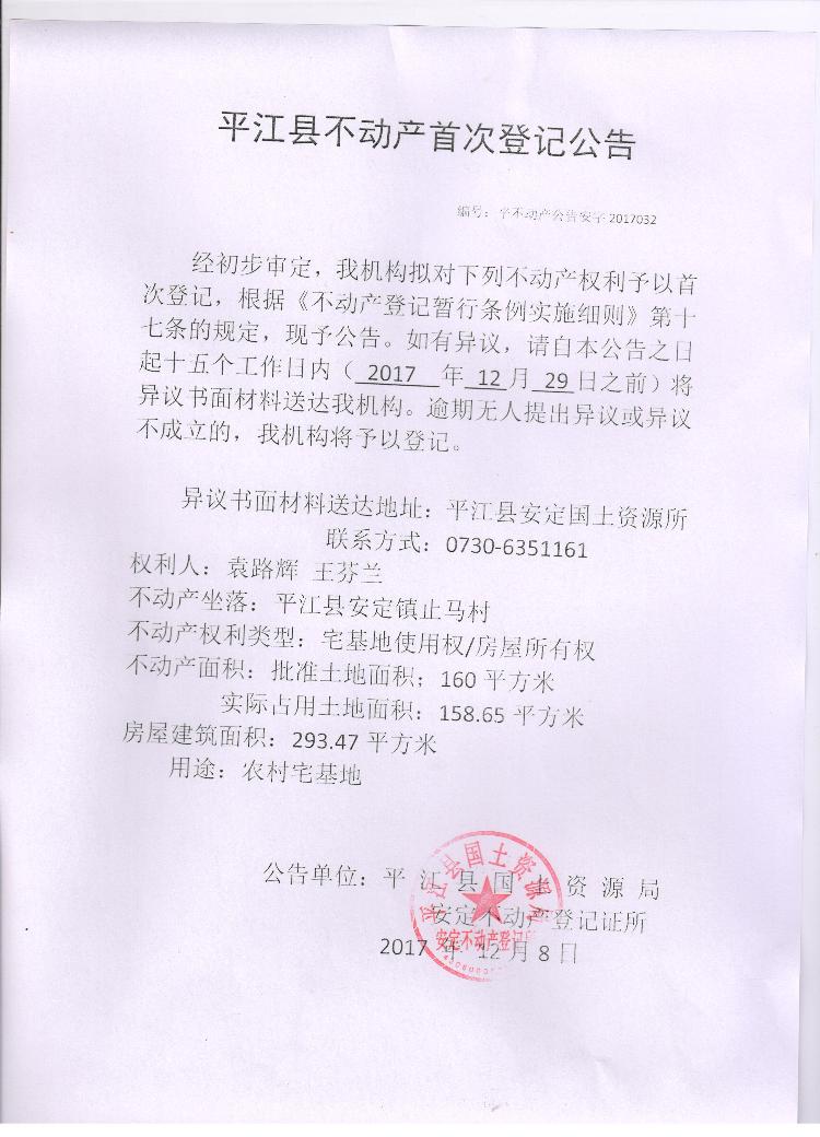 袁路辉 王芬兰不动产登记证平安字2017032