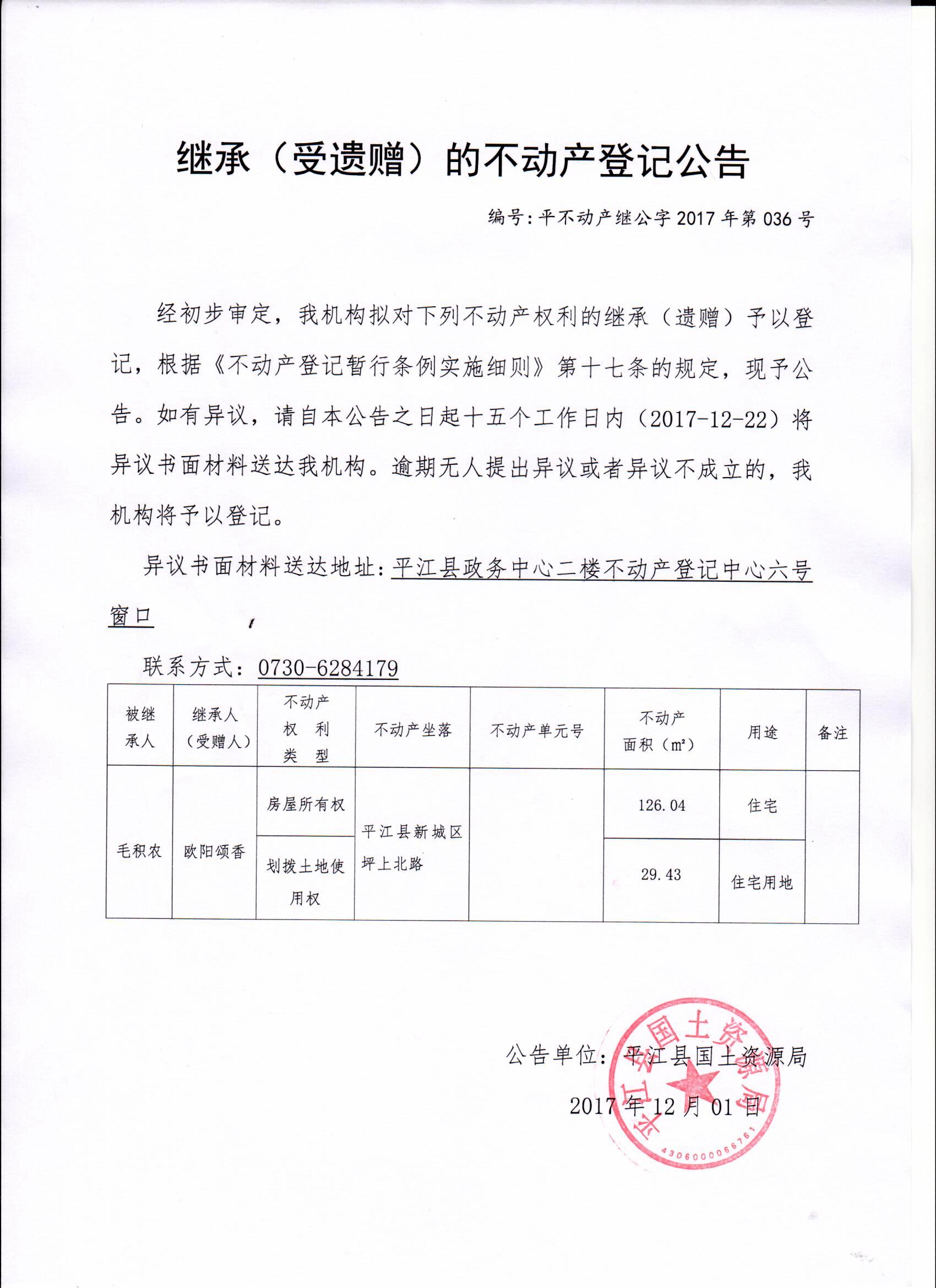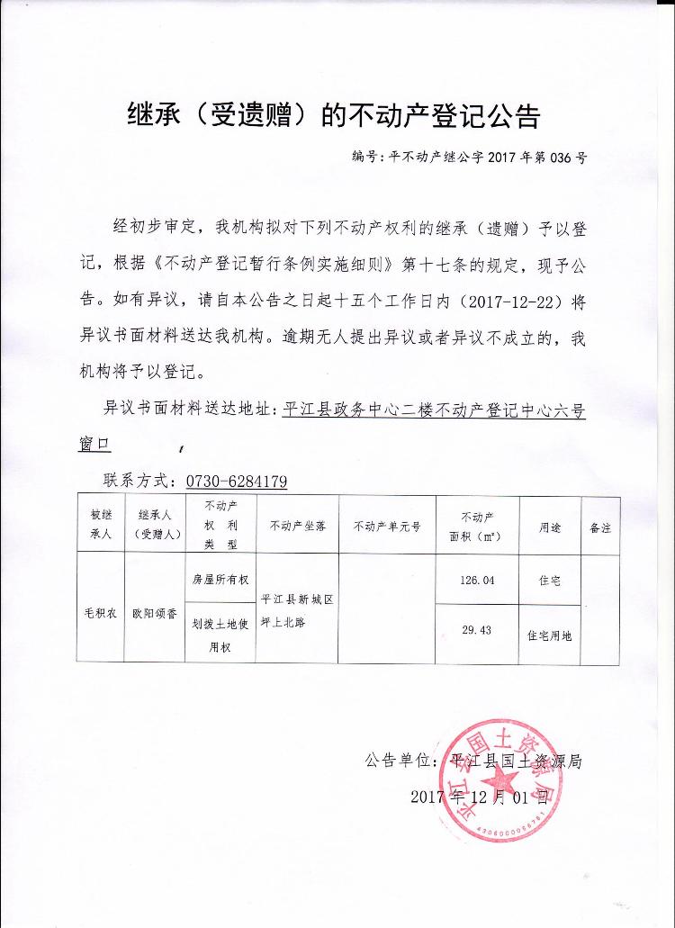 欧阳颂香继承不动产登记公告2017036号