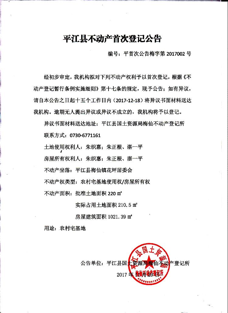 朱织惠、朱正根、湛一平不动产首次登记公告