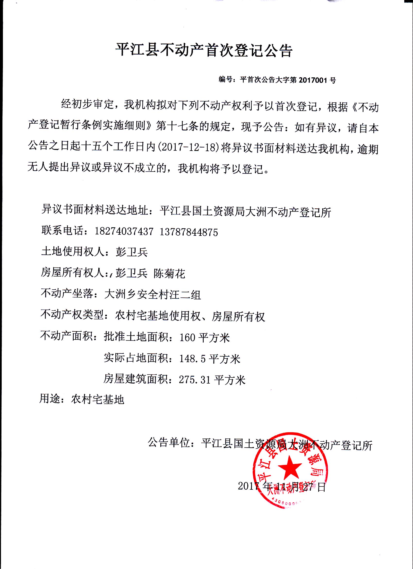 彭卫兵、陈菊花不动产首次登记公告2017001号