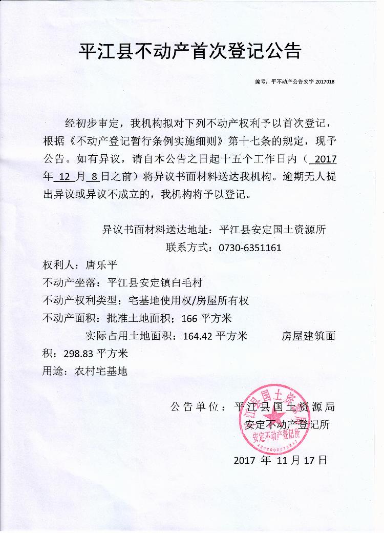 唐乐平不动产首次登记公告