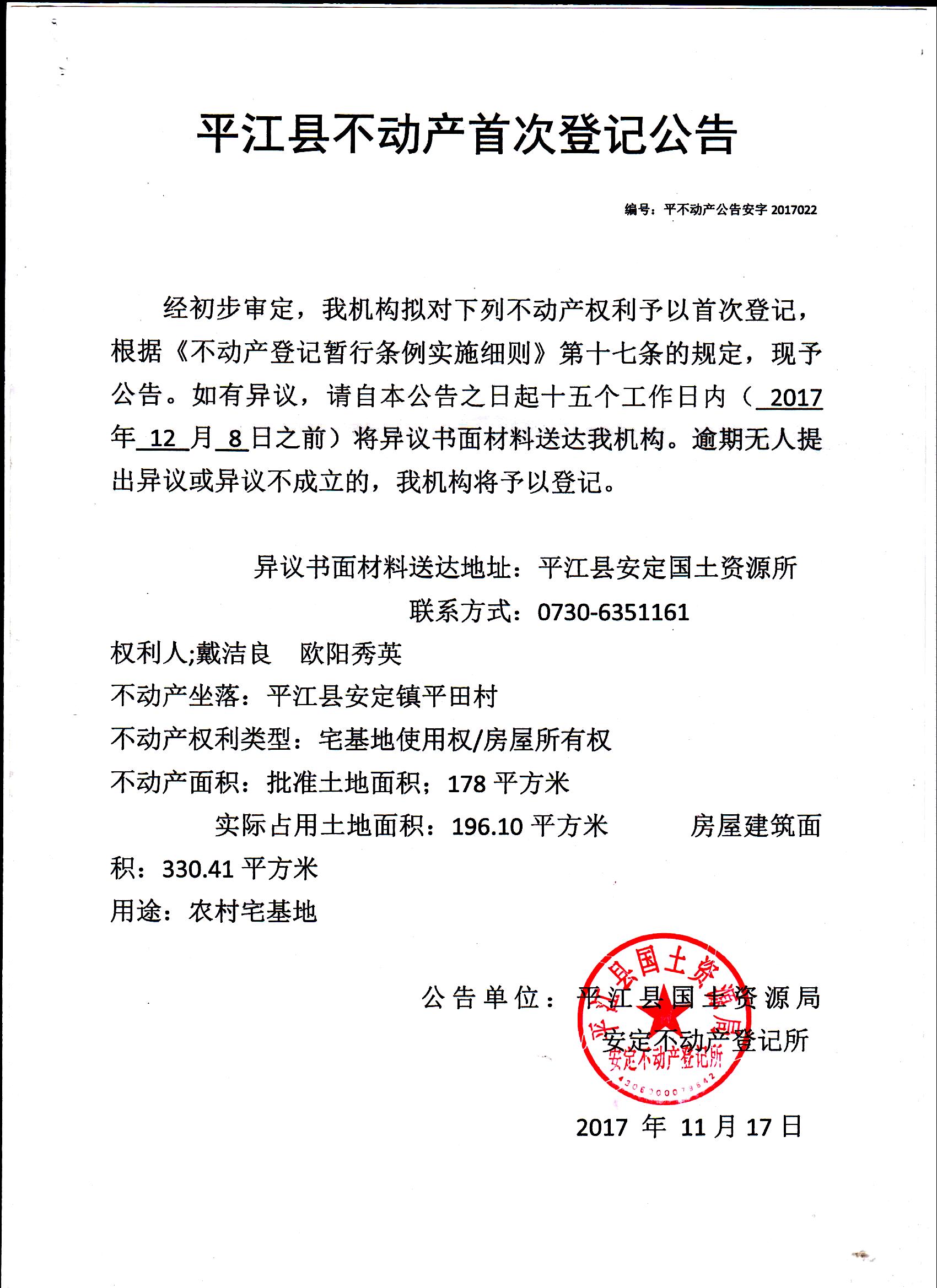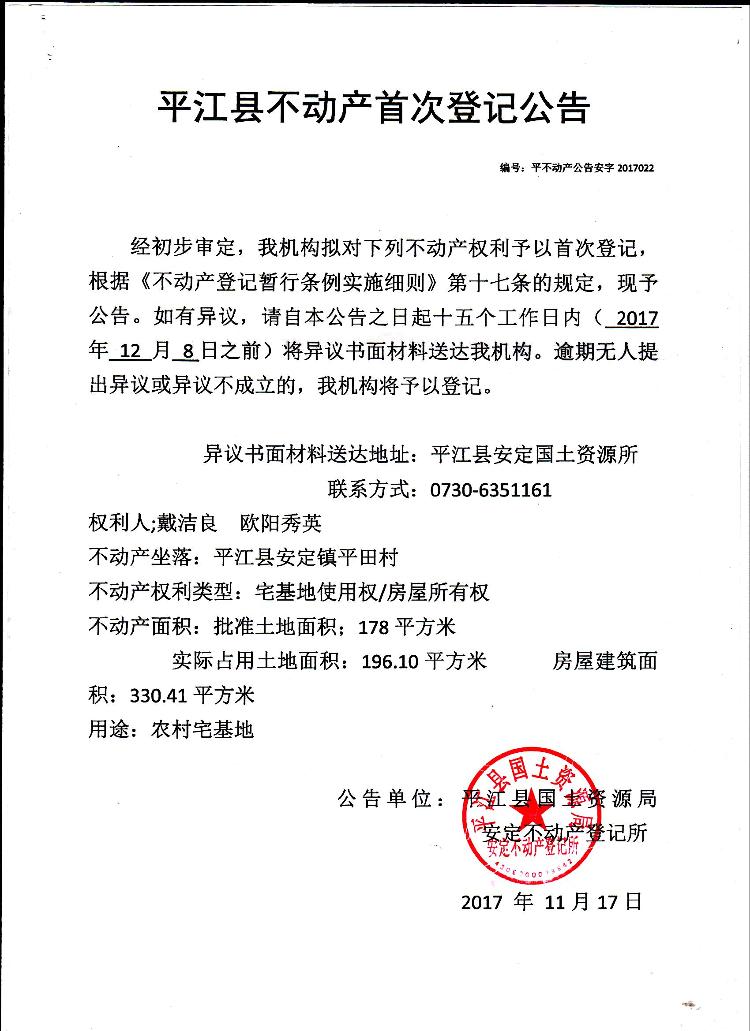戴洁良 欧阳秀英不动产首次登记公告2017022号