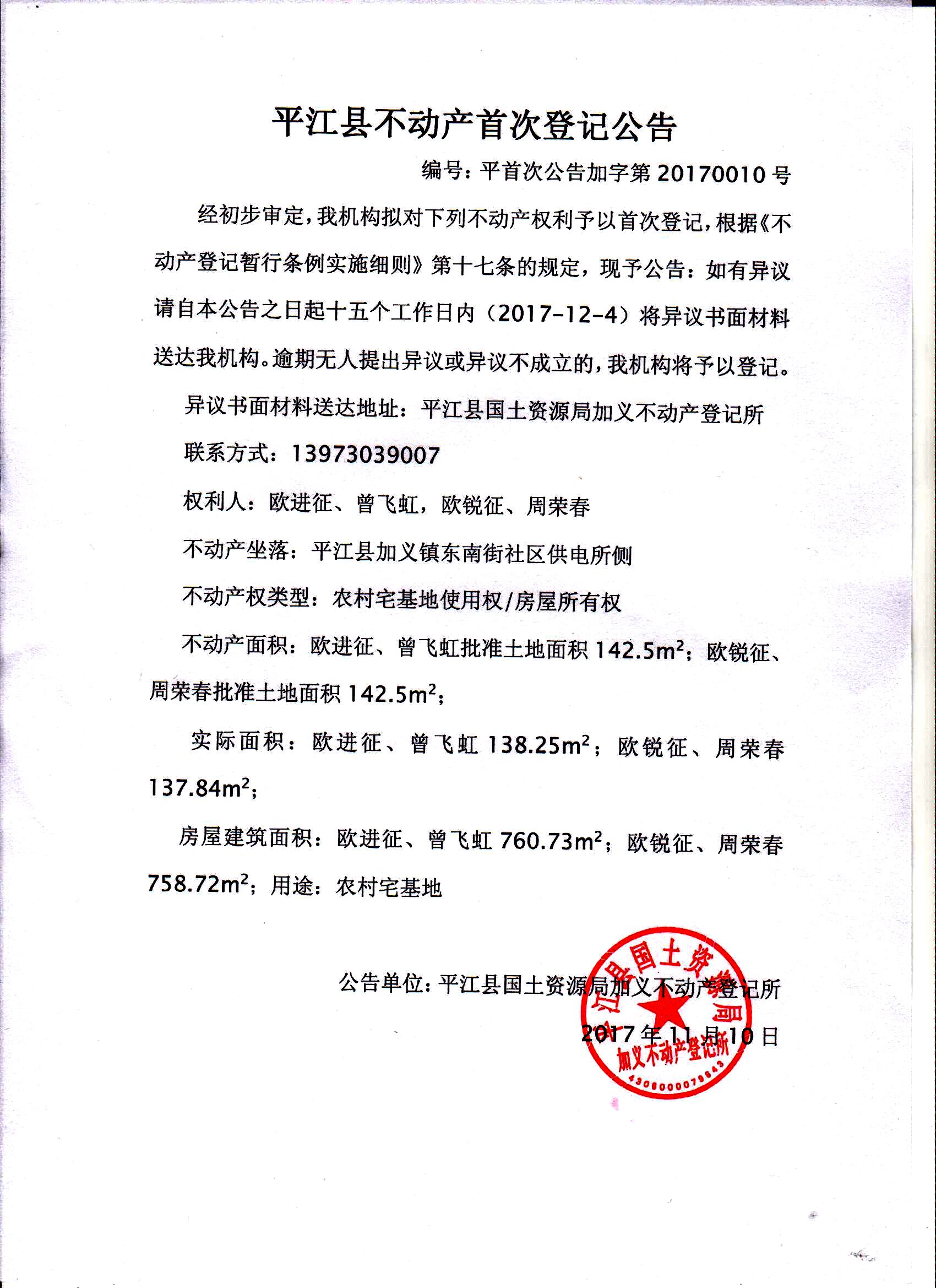 欧进征、曾飞虹、欧锐征、周荣春不动产首次登记公告