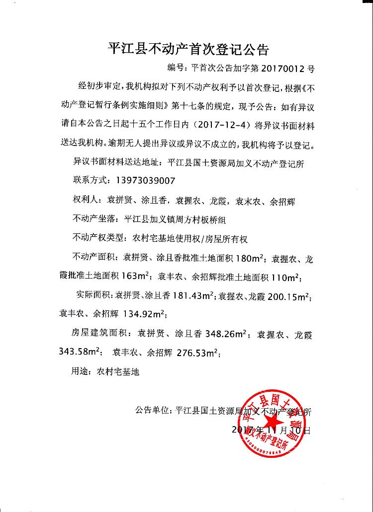 袁拼贤、涂且香、袁握农、龙霞、袁末农、余招辉不动产首次登记公告