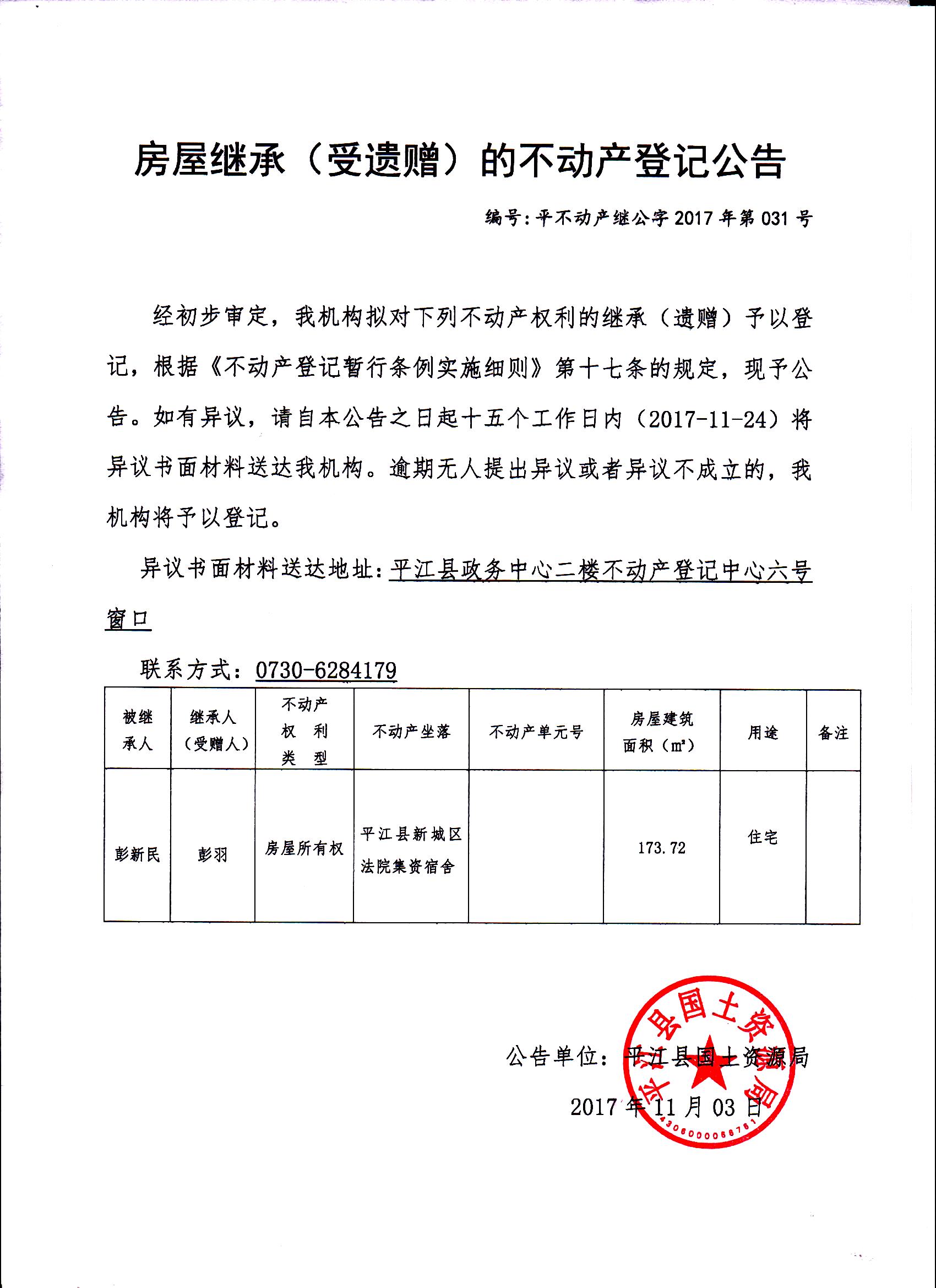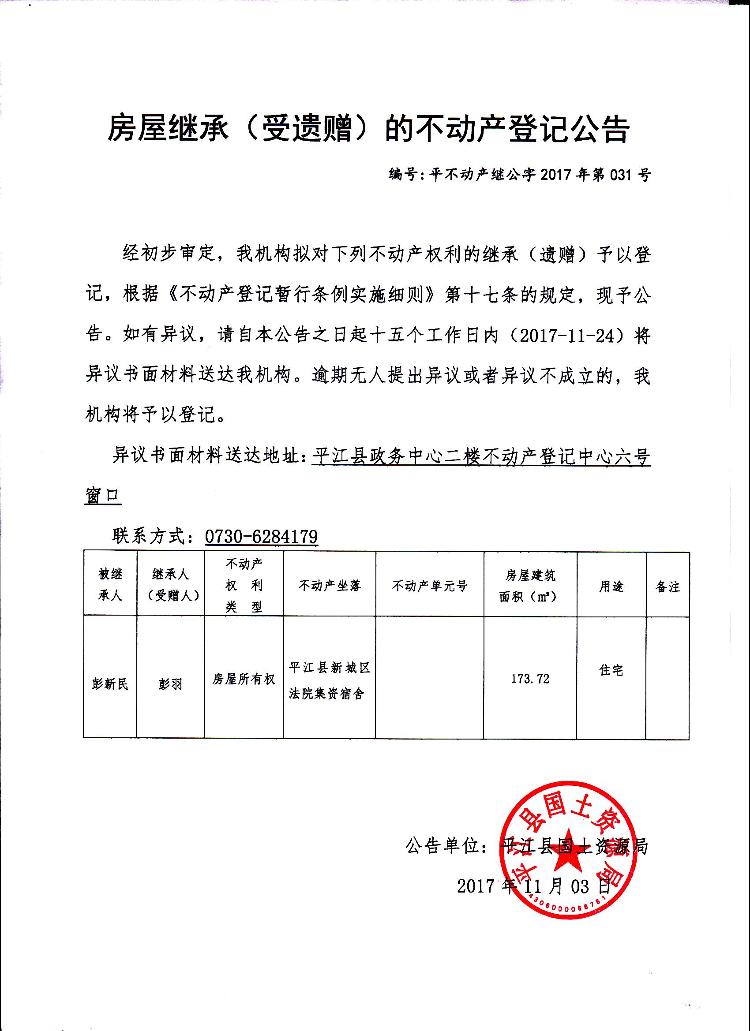 彭羽房屋继承(受遗赠)的不动产登记公告2017031号