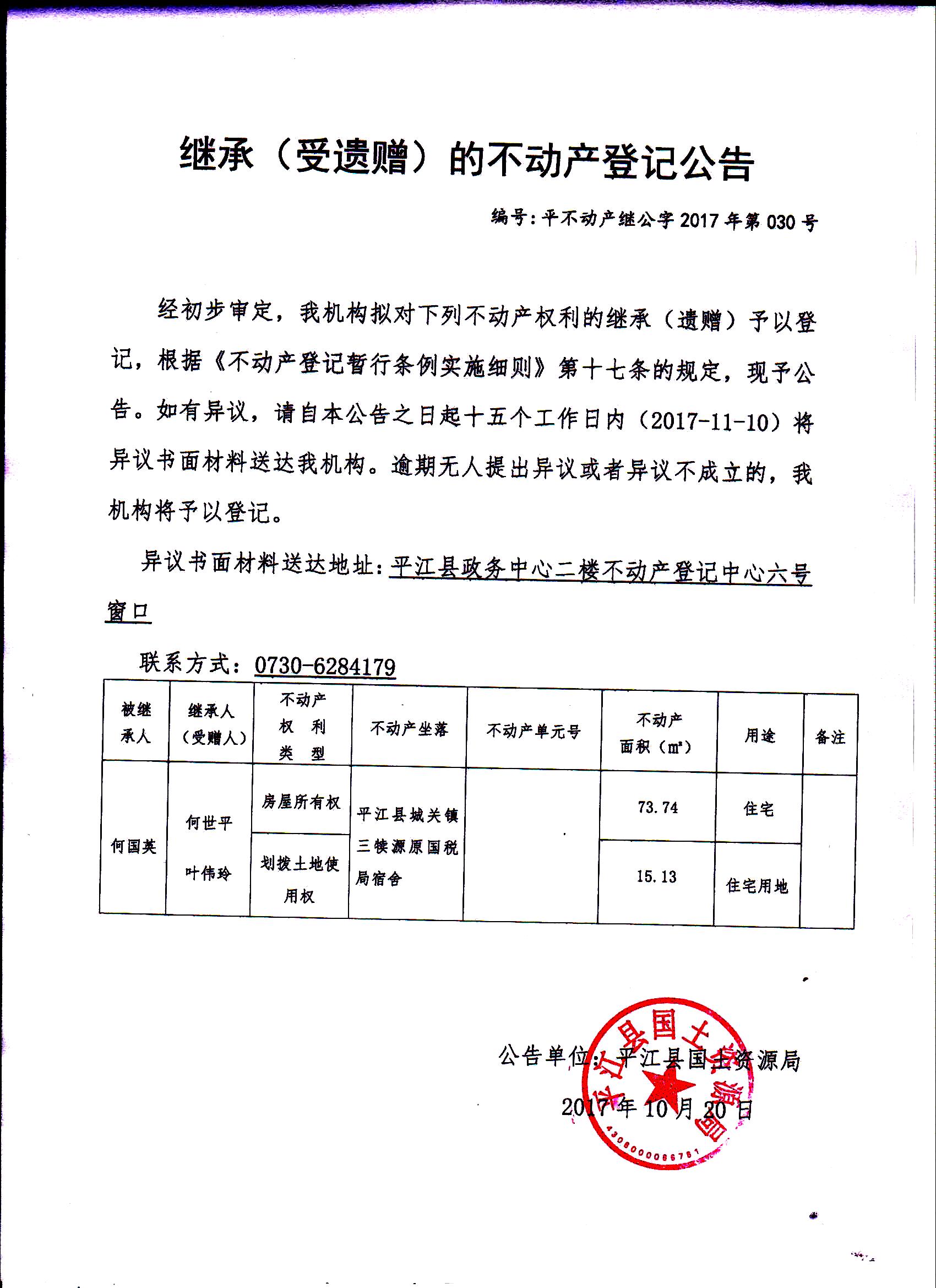 何世平、叶伟玲继承(受遗赠)的不动产登记公告