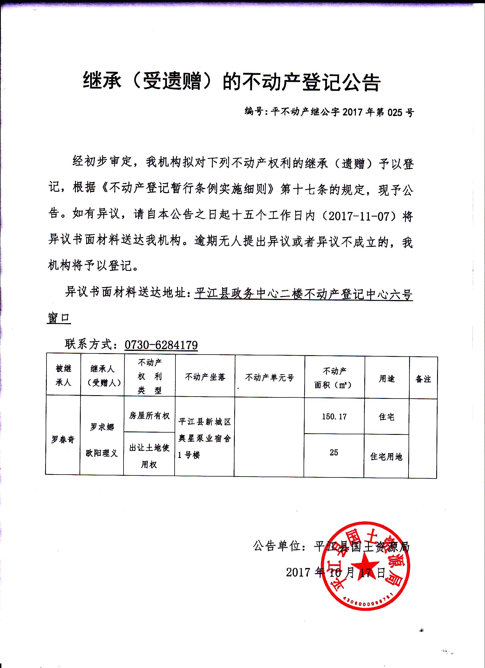 罗求娜、欧阳理义继承(受遗赠)的不动产登记公告