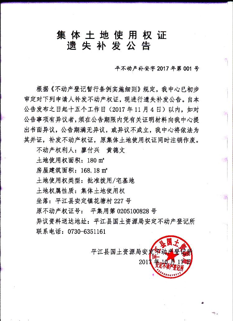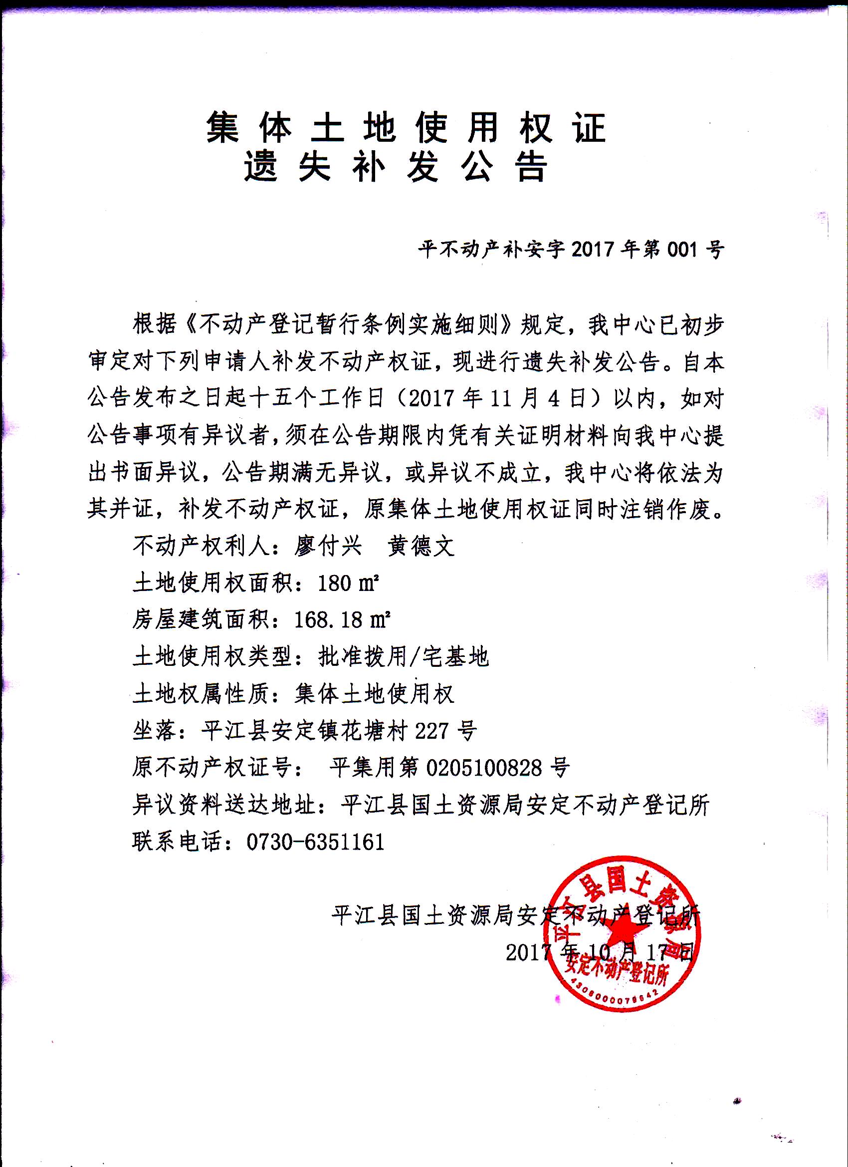 廖付兴、黄德文集体土地使用权证遗失补发公告