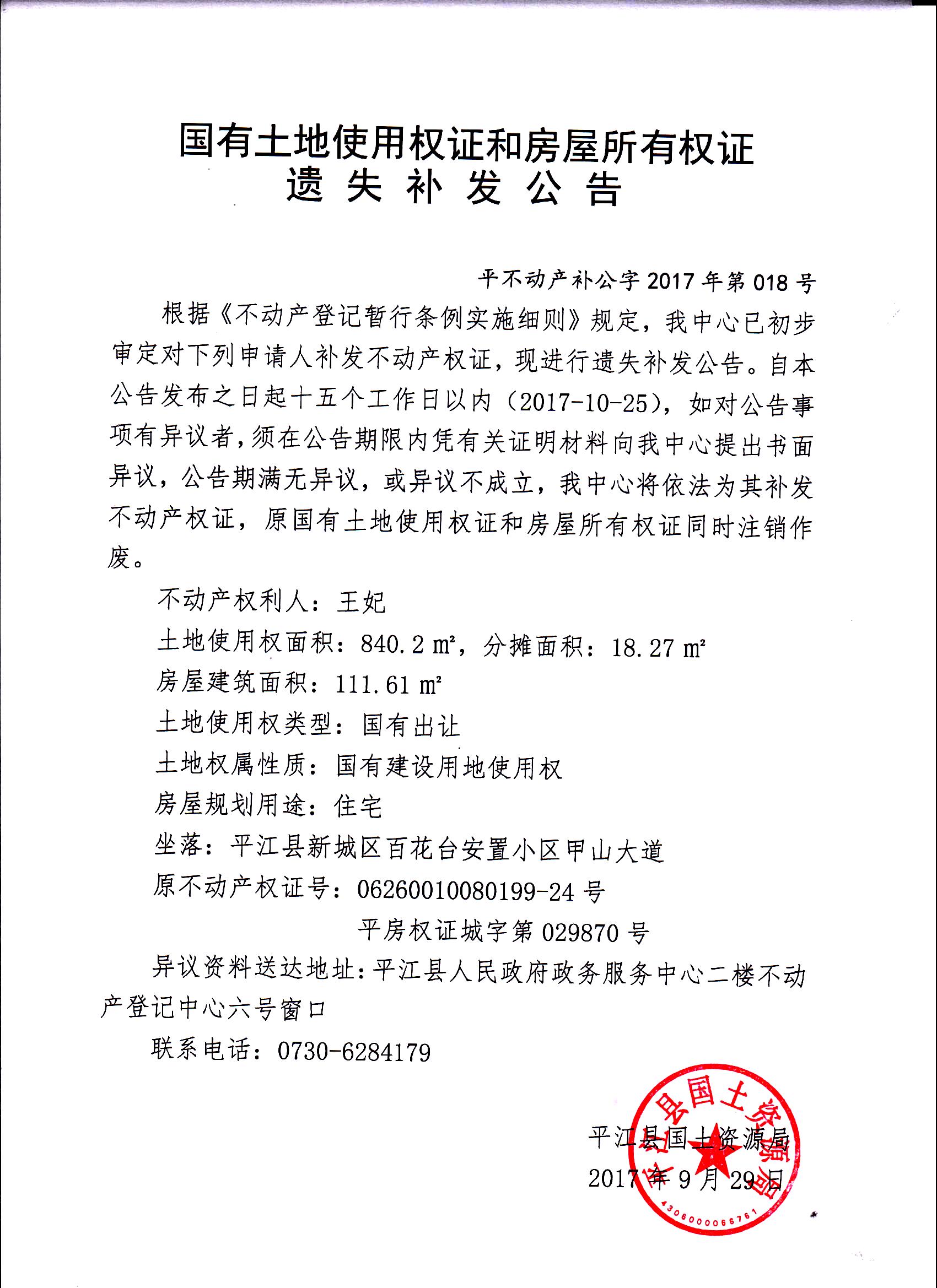 王妃国有土地使用权证和房屋所有权证遗失补发公告
