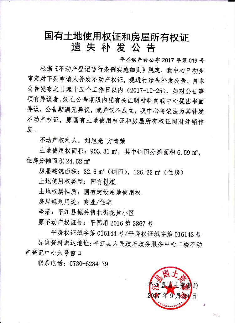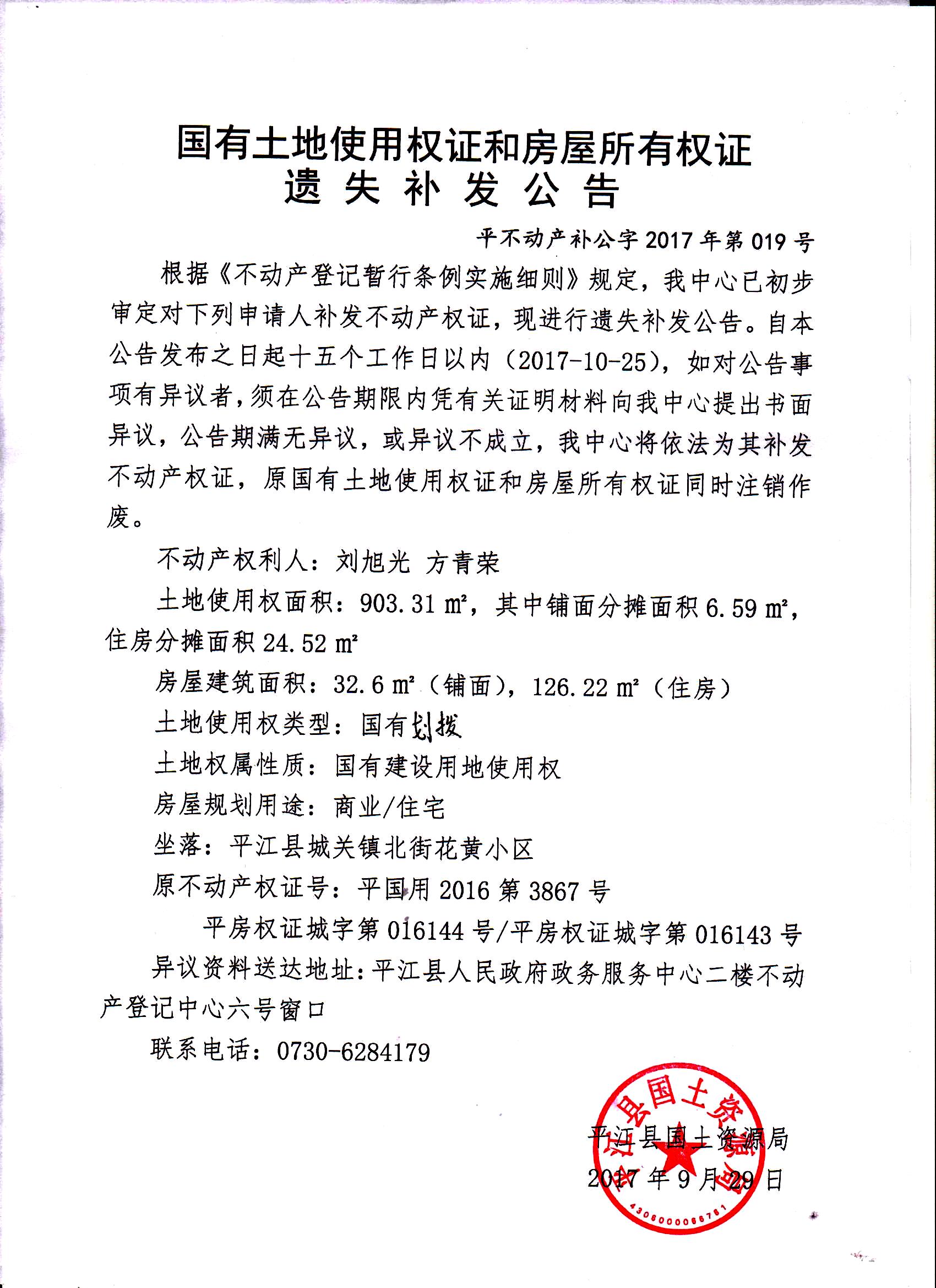刘旭光、方青荣国有土地使用权证和房屋所有权证遗失补发公告